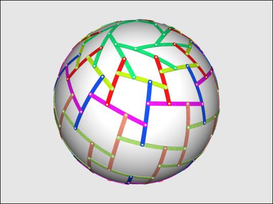 Rotegrity of polar zonohedron of 6 vectors with strap display, rendered in POV-Ray using